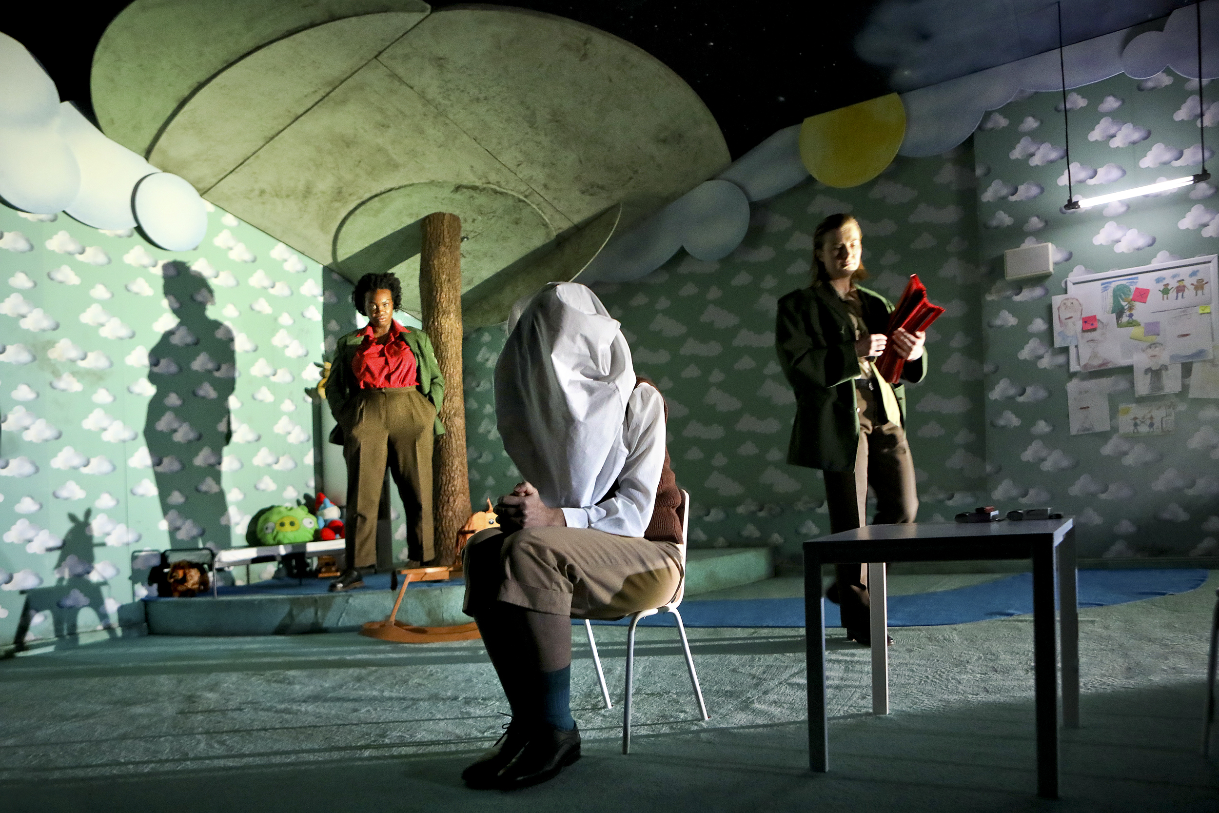 Wir beginnen im Dunkeln. Aus den Lautsprechern dringt Pablo Looks Back von Tin Hat Trio, schlichte Musik, die eine gewisse Trägheit vermittelt. Es ist schwer zu fassen, ob es sich dabei um eine gelassene oder eine melancholische Trägheit handelt. Oder beides? Langsam wird es heller auf der Bühne (Lichtdesign: Jan Hördemann), auf einem Teil der Bühne zumindest: Ein einzelner Scheinwerfer zerschneidet die Dunkelheit aus dem rechten Off heraus, lässt Teile des von Katrin Bombe gestalteten Bühnenbilds im Schatten, während er uns den Blick auf die Polizeiinspektoren Tupolski (Anna Drexler) und Ariel (Romy Vreden) eröffnet. Eingehüllt in einen Nebelschleier blicken sie finster auf den Schriftsteller Katurian (Karin Moog) herab, der mit einem Beutel über dem Kopf in einem niedriger gelegenen Teil des Kinderzimmers sitzt.