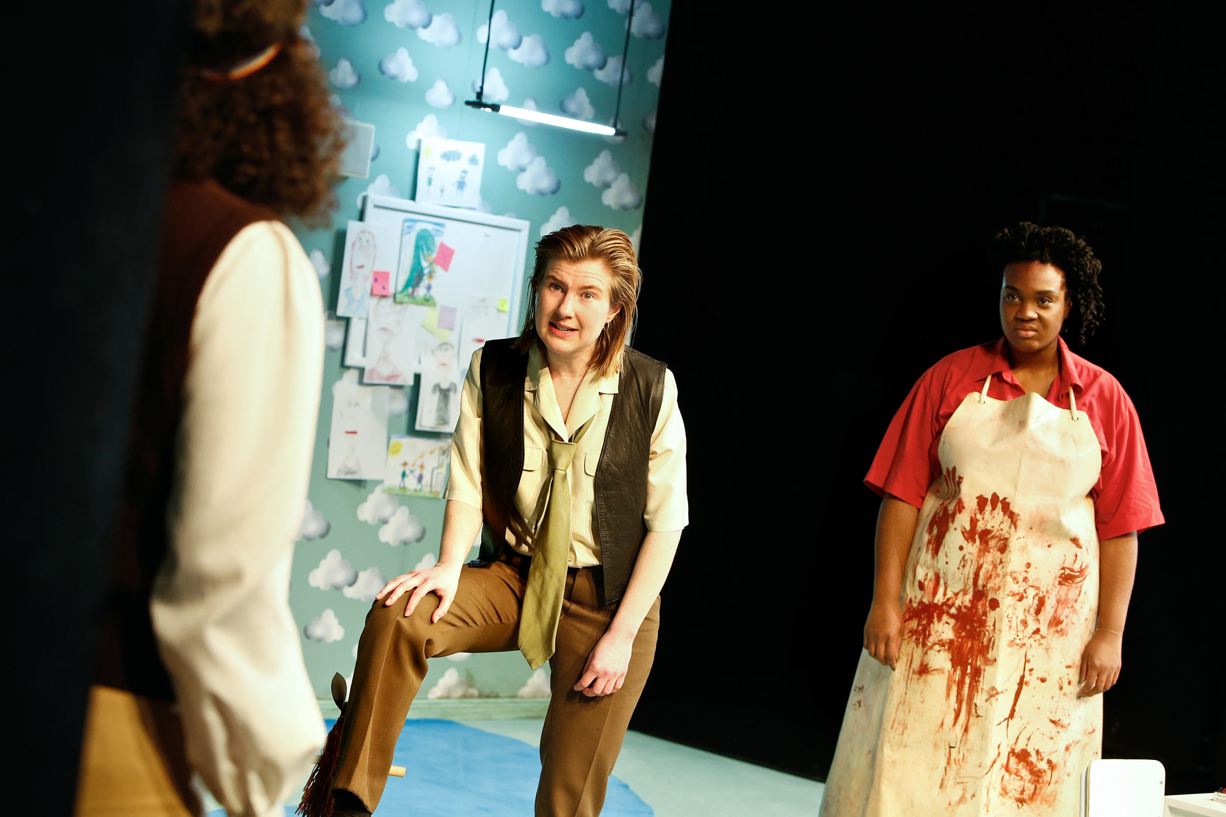 Karin Moog, Anna Drexler, Romy Vreden (v. li.); Die beiden Polizisten – Ariel in der blutbeschmierten Schürze – versuchen Katurian mit ihren Blicken einzuschüchtern.