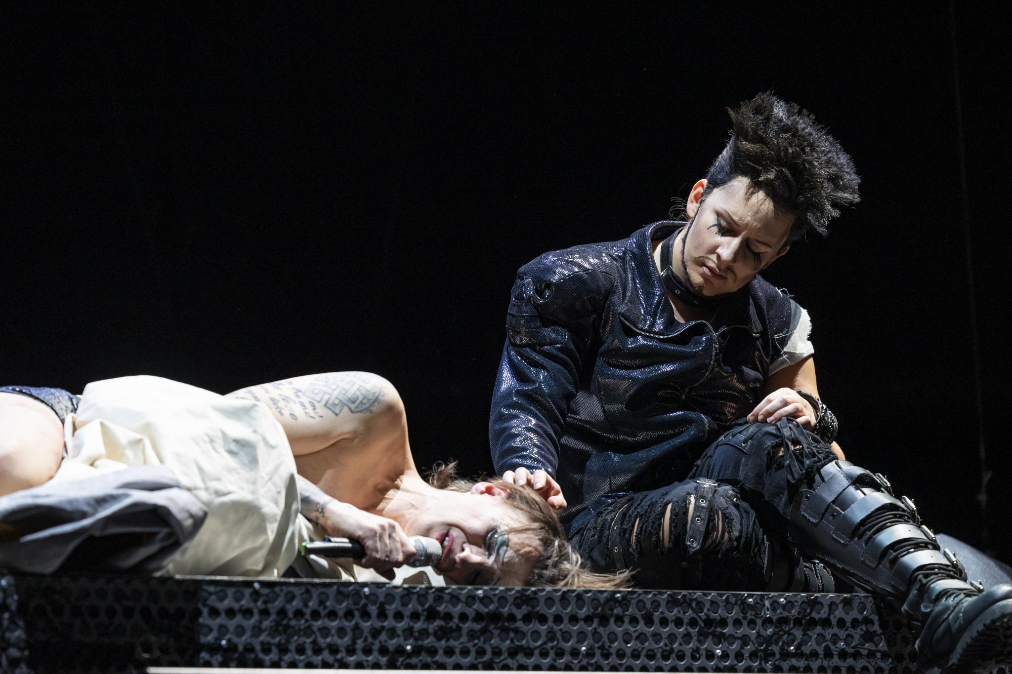 CM: Es war eigentlich relativ klar für mich, dass ich nicht alle Songs ins Deutsche übersetzen möchte. Ich bin durchaus dafür, dass man einen Song übersetzen kann und sollte, aber nicht bei dieser Art von Musik. Zudem befinden wir uns in einer Konzertsituation. Die Übersetzung ist in vielen Dingen auch nicht wirklich gut und wechselt an manchen Stellen willkürlich zwischen Deutsch und Englisch. Für mich war es wichtig, dass der Titel Origin of Love auf Deutsch gesungen wird, weil er das essenzielle Thema des Abends beinhaltet und Exquisit Corpse zum Schluss wird ein deutsches Punklied, das Hedwigs Gefühlszustand und Lebensweg auf den Punkt bringt. Alle anderen Songs erklären sich durch den Kontext. Da ist man, glaube ich, musikalisch dabei und muss nicht jedes Wort verstehen — der Inhalt erklärt sich einfach durch die Situation. Man kann dem Publikum auch durchaus etwas zutrauen. Als ich mit Alex über die Umsetzung gesprochen habe, wollte er auch bei der Originalsprache bleiben.