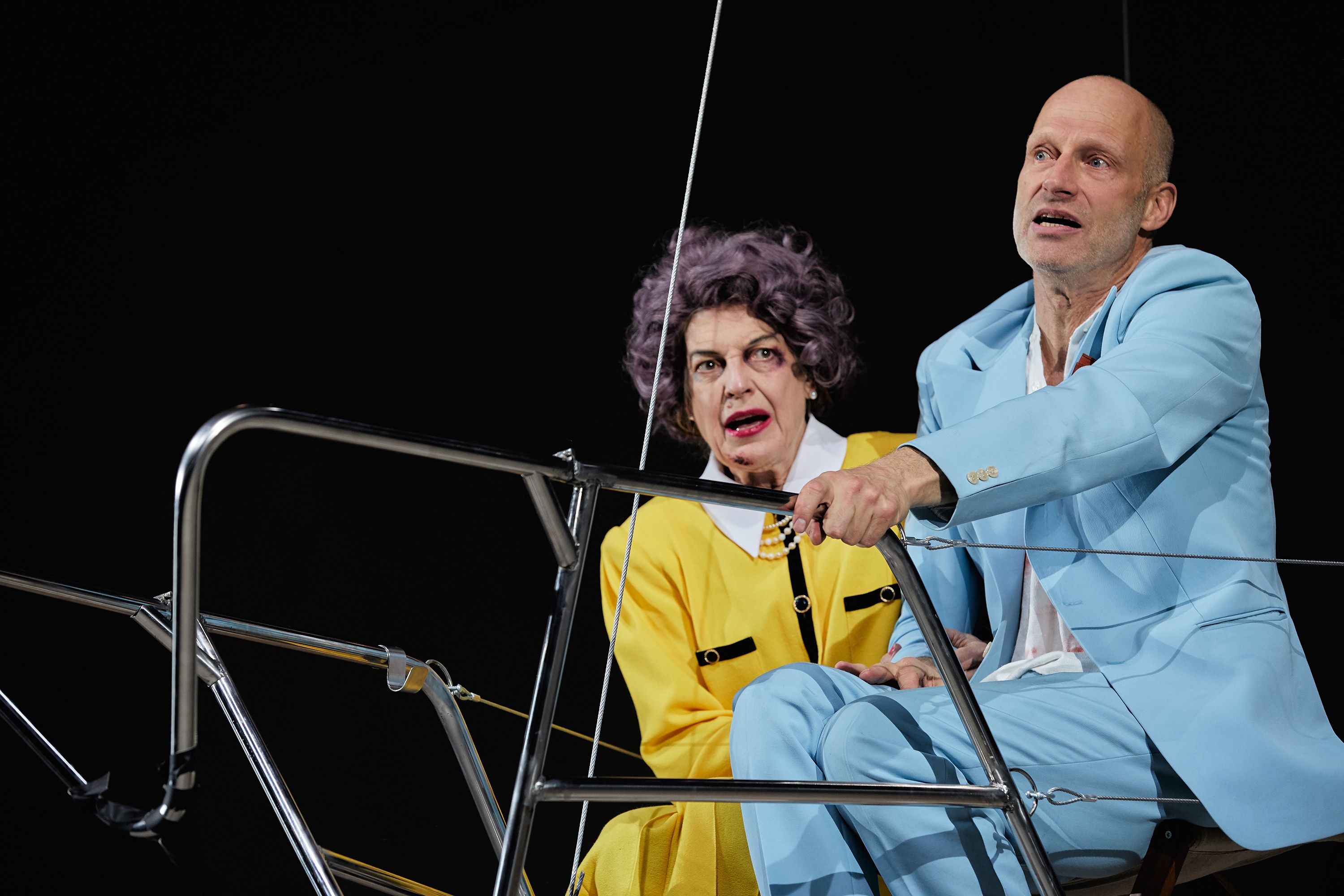 Lautlos, winzig, im zitronengelben Kostüm betritt diese (Angela Winkler) wenig später die Bühne und der Kampf beginnt: Er wirft ihr ihre Verwahrlosung vor, sie ihm mangelnde Fürsorge. Der Teufelskreis ist perfekt: Ist er so egoistisch, weil sie ihn dazu gemacht hat oder sie so verbittert, weil er sich nicht kümmert? Auch Christian bemerkt die Ausweglosigkeit dieser verkorksten Situation und beschließt die Mutter einzuladen. Eine Reise ins Berner Oberland soll die verfahrene Beziehung der beiden retten – eine Reise in seine Kindheit und das Innerste der Figuren.