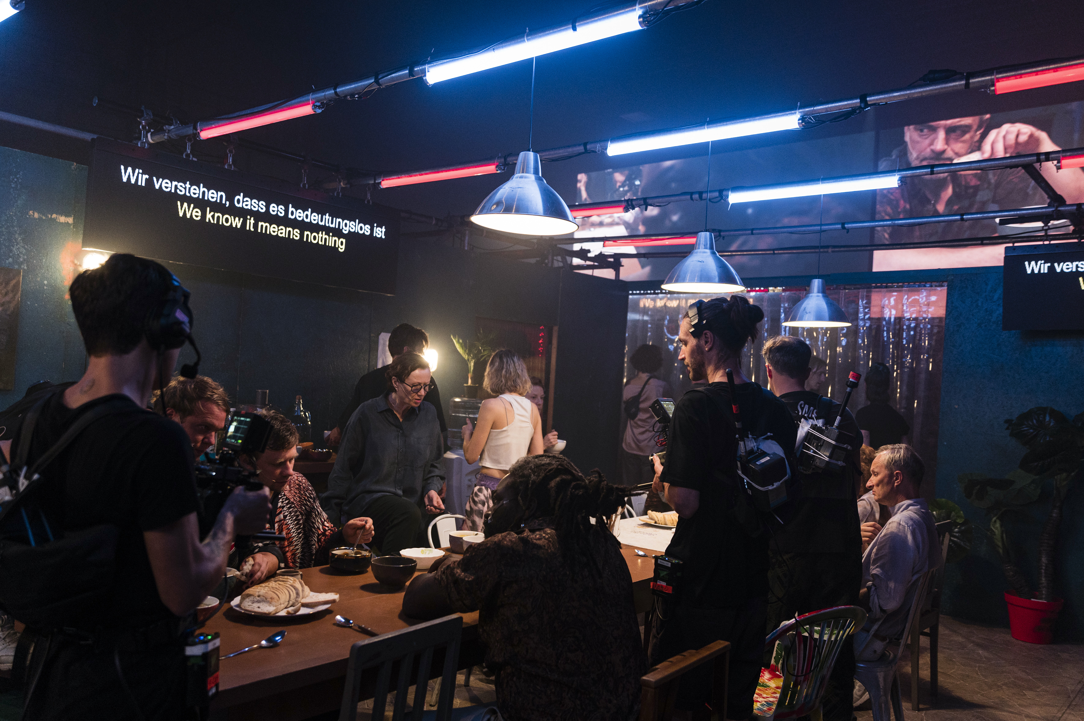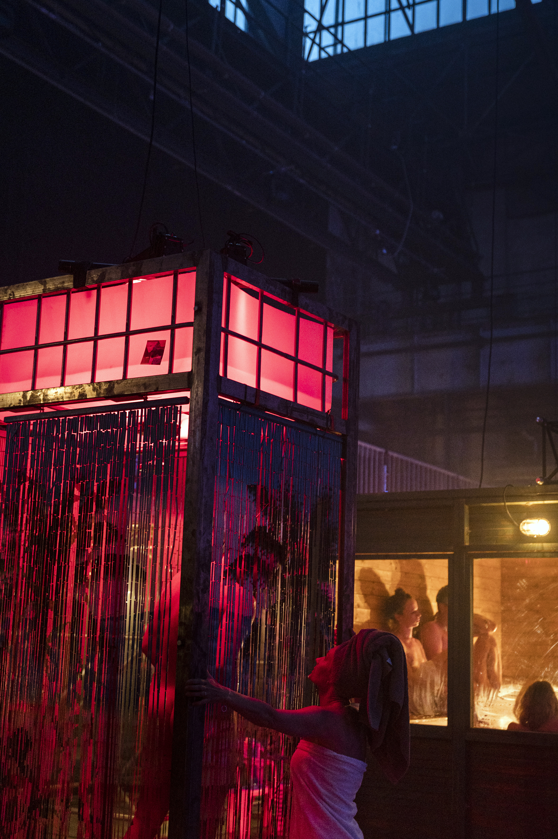 Was wir sehen, wenn wir die Halle durchstreifen: eine Rekonstruktion dieser Geschichte, zu Kunst gewordene Erinnerung, dramatisierte Utopie. In kleinen Holzhütten sehen wir die Welt des Kollektivs – hier eine Sauna, dort eine unaufgeräumte Küche, links das Schlafzimmer, rechts das Wohnzimmer (Fabien Lédé). Die Darstellenden lungern auf dem Bett herum, gießen sich einen Drink ein, tanzen in einer Miniaturdisko vor dem DJ-Pult. Erst als das Abendlicht langsam die Halle mit konspirativem Dunst erfüllt, beginnt das Spiel, das sich aus unterschiedlichen Szenen an den verschiedenen Orten und bisweilen simultan zusammensetzt. Übertragen werden die einzelnen Szenen auf große Leinwände in der Mitte der Halle. Uns Zuschauer:innen ist überlassen, ob wir die Räume betreten und den Performenden nah sein wollen oder den Film mit Untertiteln sehen wie im Kino. Dabei drehen sich die Dialoge immer wieder um das Zusammenleben, um Gemeinschaft, Beziehungen, Sex. Darum, wer als letztes das Licht angelassen hat. Dass 7 % der Reichsten 80 % der Treibhausgase verantworten. Doch trotz diesen unmittelbaren Dialogen möchte sich keine wirklich intime Stimmung einstellen. Zu konturlos bleiben die Figuren, zu unnahbar – und das, obwohl die Leistung der Schauspielenden durch ihre Unaufgeregtheit und Natürlichkeit positiv heraussticht. Vielleicht liegt es auch an der fremden Sprache (Litauisch) und der ständigen Präsenz vieler Techniker:innen.