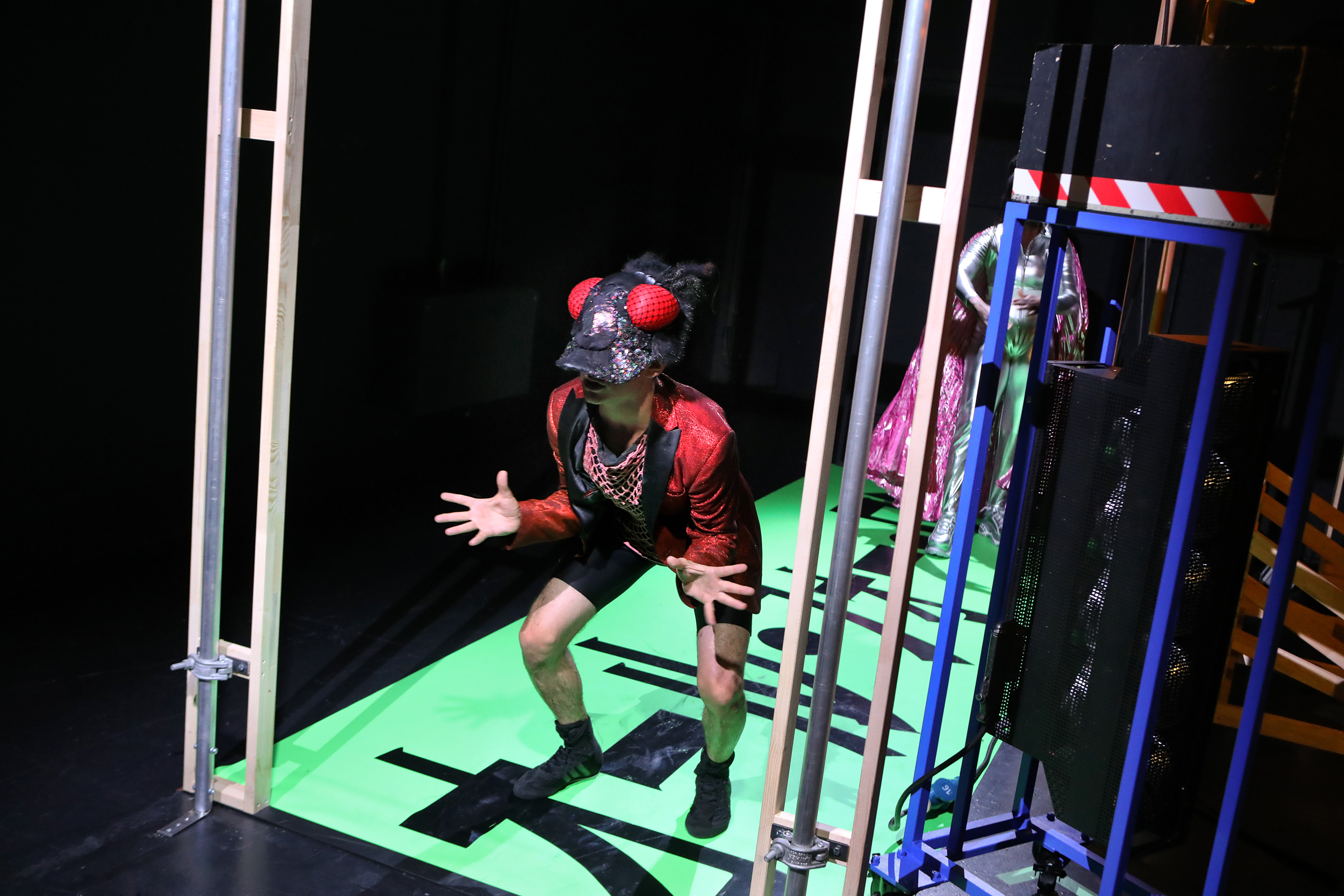 Und hier sind sie schon: Lapsus of Light – der mit seiner Delfinlampe das ganze Publikum zum Lachen bringt; Lana Morello in einem wunderschön grell, glitzernden Superheldinnen-Outfit im 80er-Jahre-Stil (ein großes Lob an Frederike Marsha Coors); die dauer-summende Fliege und Asha12 mit beeindruckender elfenartiger Maske. Doch können diese ulkigen Vier uns wirklich retten? Was ist überhaupt ihre Mission? Dass scheint keine*r so wirklich zu wissen, als sie alle an diesem fremden Ort auftauchen. Wie sind sie dort gelandet und warum? Und vor allem – Wie kommen sie dort wieder heraus?