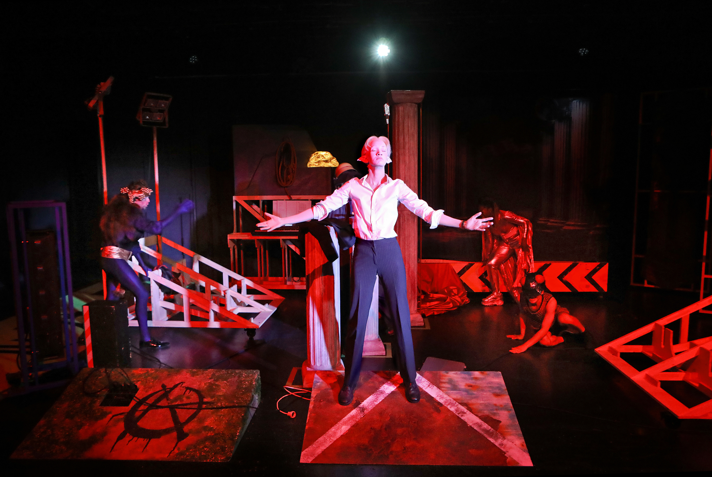 Nicht nur das Zitat von Jean Paul Sartre „Die Hölle das sind die Anderen“ vermittelt eine höllenartige Stimmung à la Geschlossene Gesellschaft, auch die Bühne trägt dazu bei. Die vier Charaktere scheinen gefangen auf der kleinen Studiobühne, die zunächst schlicht und trist wirkt. Der Raum ist leer bis auf ein paar Tücher, die irgendetwas zu verstecken scheinen. Sobald das Geheimnis, was sich unter den mysteriösen Tüchern befindet, gelüftet wird, entfaltet sich aber die gesamte großartige Leistung von Thilo Ullrich und die Szenerie nimmt Farbe an.