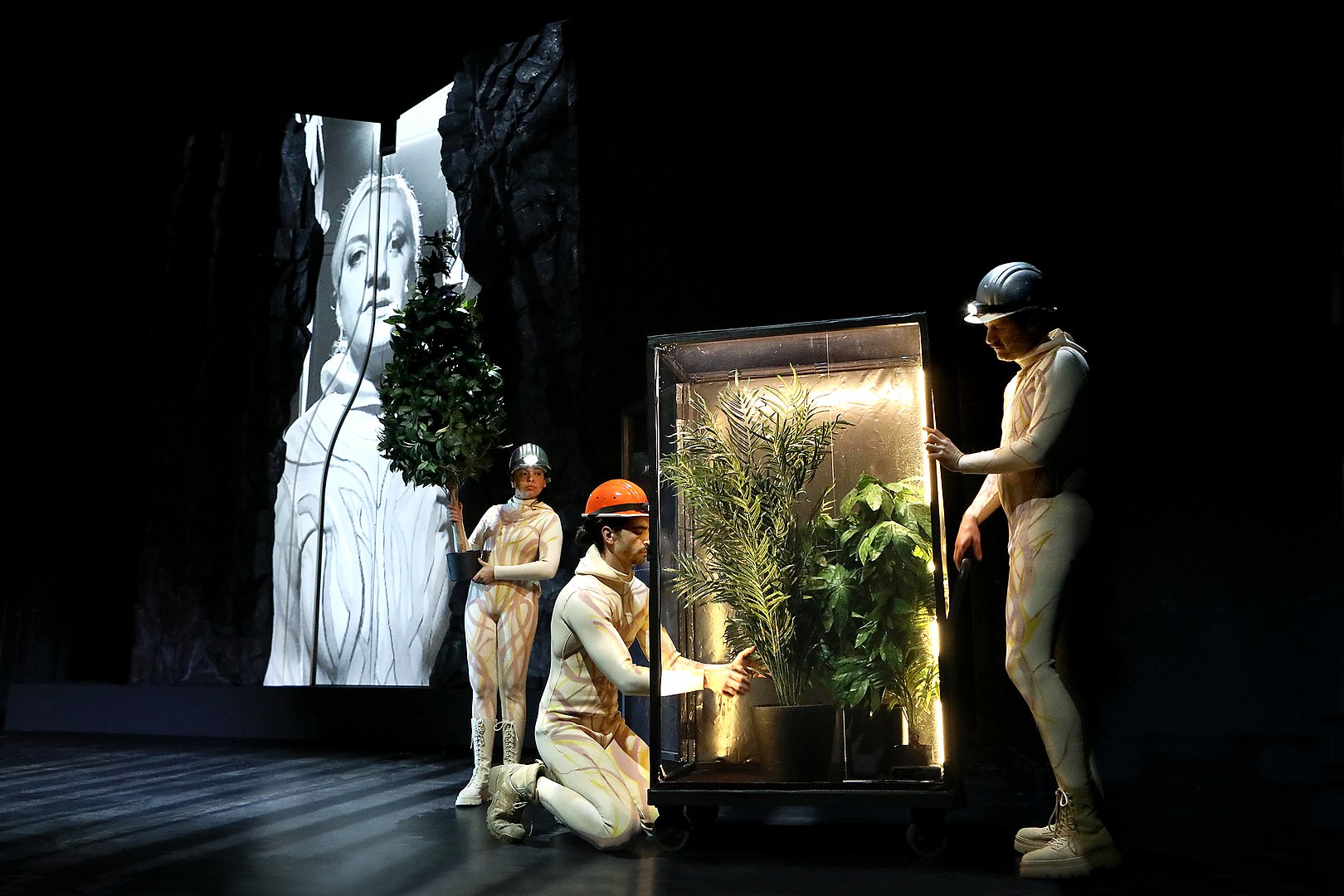 Die Zeit springt. Nun haben wir das Jahr 2040. Das Bühnenbild verändert sich, dreht sich wie die Erde, zeigt kohlschwarze Schachtwände. Die Erdoberfläche ist nicht mehr bewohnbar. Schuld ist der Klimawandel. Wer es sich leisten kann, reist auf den Mars. Die Übriggebliebenen müssen sich auf ein Dasein unter Grund vorbereiten. Der Bergmann hat wieder eine Aufgabe: Er gibt sein Wissen über das Leben in den Schächten an seine Tochter, eine frustrierte Aktivistin, einen Bauern und einen prinzipienlosen Minister weiter.