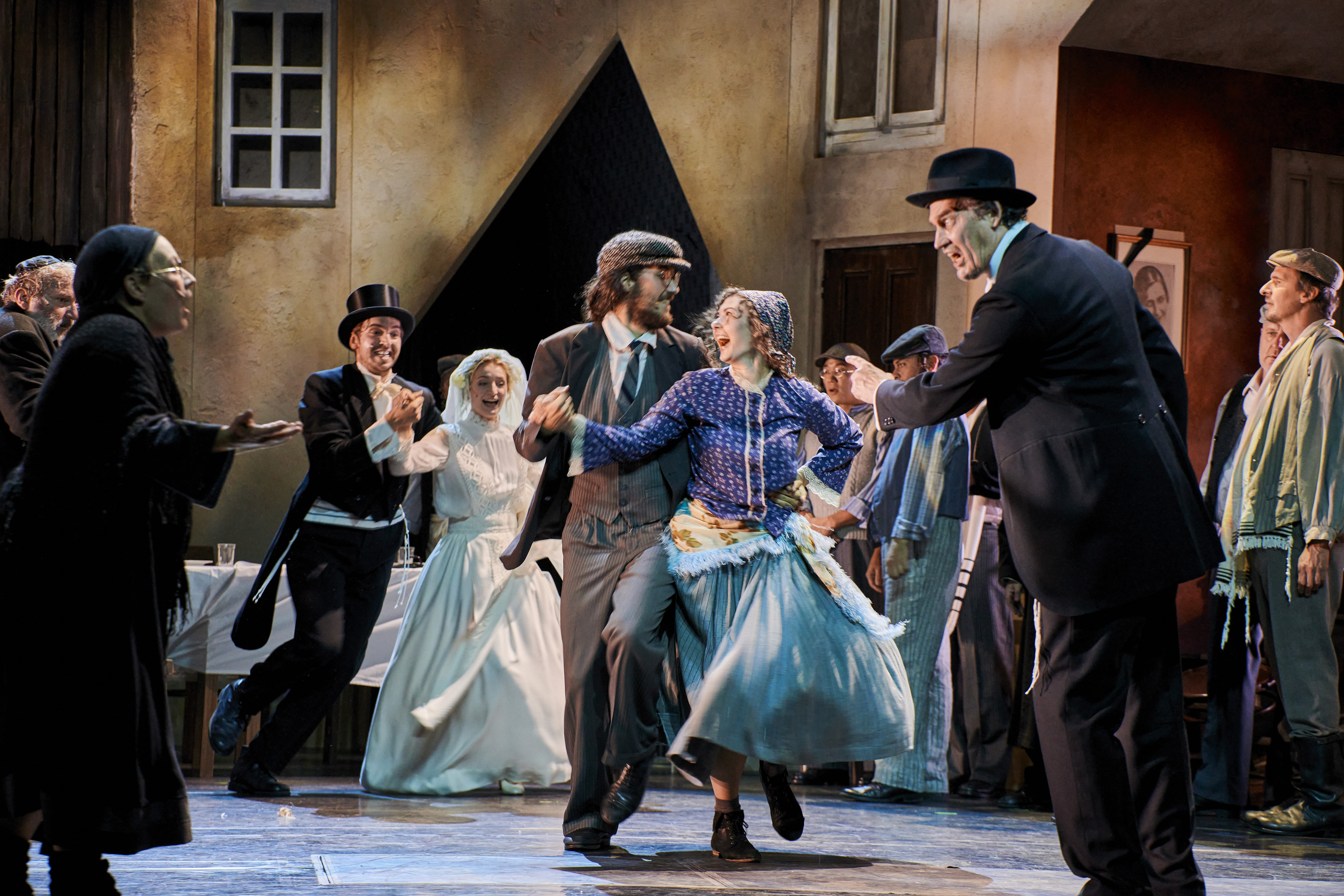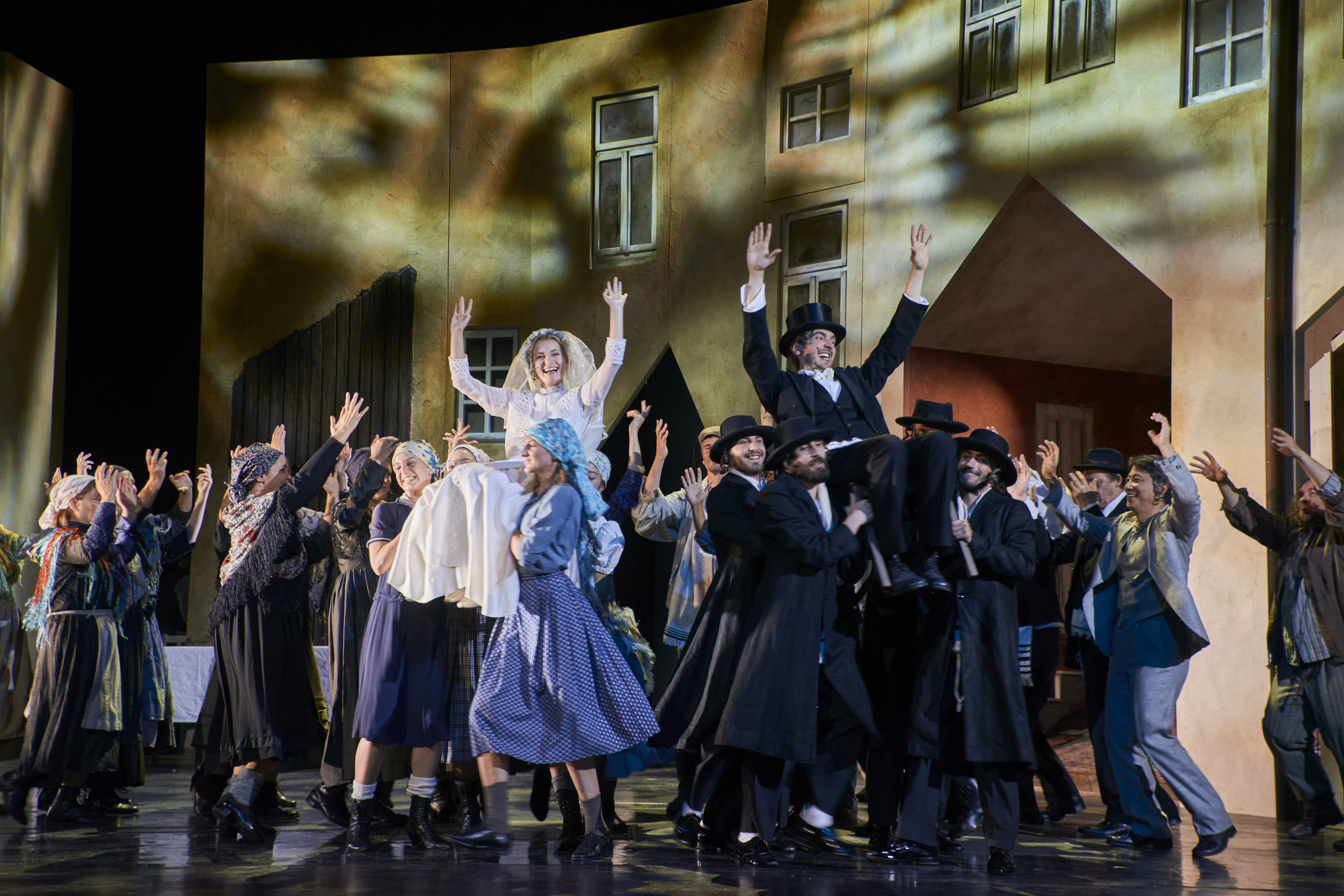 Hanna: Wagt man es, den Stoff des Musicals aus heutiger Perspektive – geprägt vom feministischen und postmigrantischen Diskurs – zu betrachten, so legt sich die erste musikalische Nummer “Tradition” wie ein dunkler Schleier über das gesamte Stück: Denn “Männer sind nicht zum Anschauen da, sondern zum Heiraten”, lautet es in dem Text. Und Frauen? Denen ist es in der jüdischen Gemeinde Anatevka verboten zu lernen, sie übernehmen die Kinderbetreuung und den Haushalt. Nicht nur ein Klischéebild der Frau, sondern auch das einer religiösen Gemeinde. Denn über die feucht-fröhlichen Lieder und Lobgesänge über Tradition und Religion hinweg vergisst man, dass Anatevka ein isoliertes Dorf ist und sektenartige Strukturen den Alltag bestimmen. Die Klarinette nimmt dreckig ein paar Halbtöne mit, während wir Männer mit Kippa und Pejot, der charakteristischen Schläfenlocke orthodoxer Juden, sehen. In der Darstellung dieser kleinen Glaubensgemeinschaft könnte allerdings auch der Trugschluss provoziert werden, jüdisch zu sein, gehe mit diesen traditionellen Werten, die hier dargestellt werden, einher.